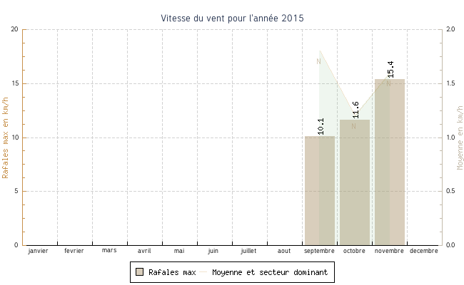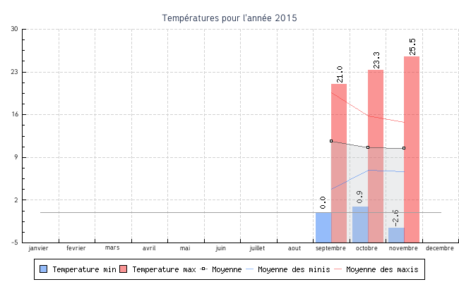 | novembre | -2.6 °C | 6.7 °C | 25.5 °C | 14.8 °C | 10.5 °C | 1.6 km/h | 15.4 km/h | N |